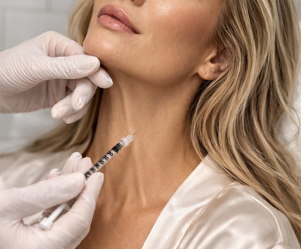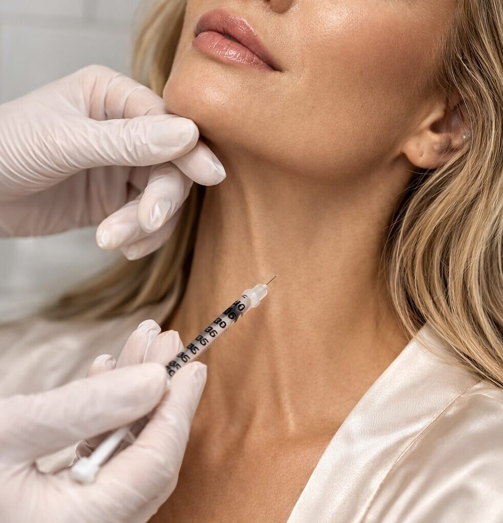 During the procedure, small injections are carefully placed along the jawline and into the platysma muscle in the neck.