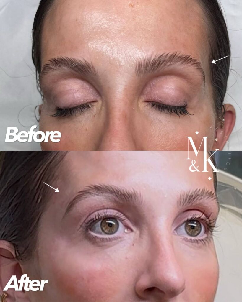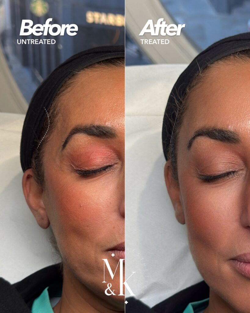 The temple area contains important blood vessels and requires advanced anatomical knowledge. Treatments at M&K Aesthetics are performed by experienced medical practitioners using precise techniques to maximise safety and natural-looking results.